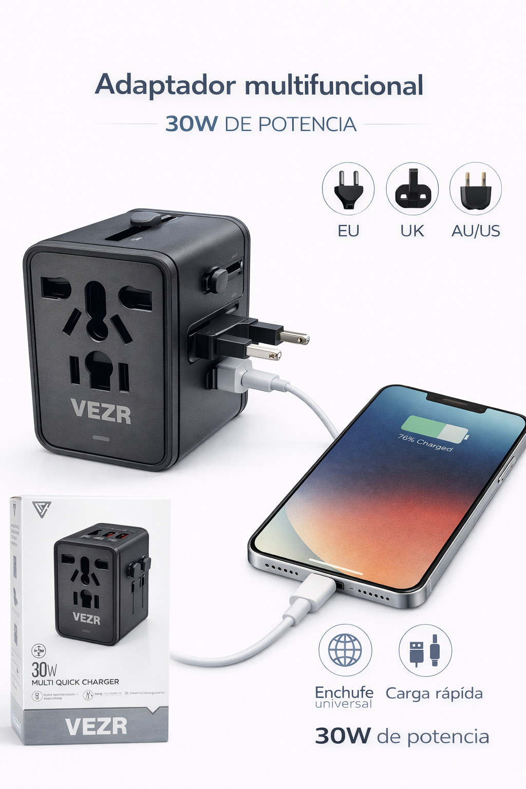 El Adaptador de Tomada VEZR VZ003 de 30W es un cargador multifuncional diseñado para ofrecer carga rápida, práctica y segura para diversos dispositivos electrónicos. Su potencia permite cargar celulares, tablets y otros equipos compatibles con mayor eficiencia.