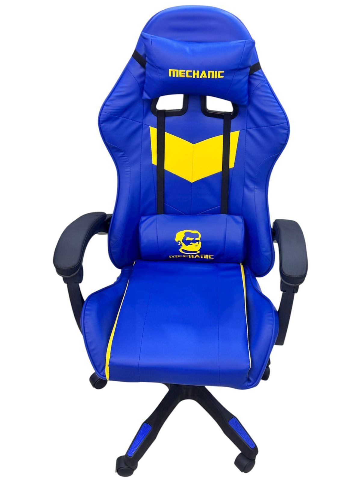 La Mechanic Pro150 combina comodidad, ergonomía y estilo en un solo diseño. Fabricada con cuero sintético de alta calidad en un llamativo color amarillo y azul, cuenta con almohada cervical, apoyabrazos ajustables y respaldo reclinable, ofreciendo el máximo confort durante largas jornadas de juego o trabajo.